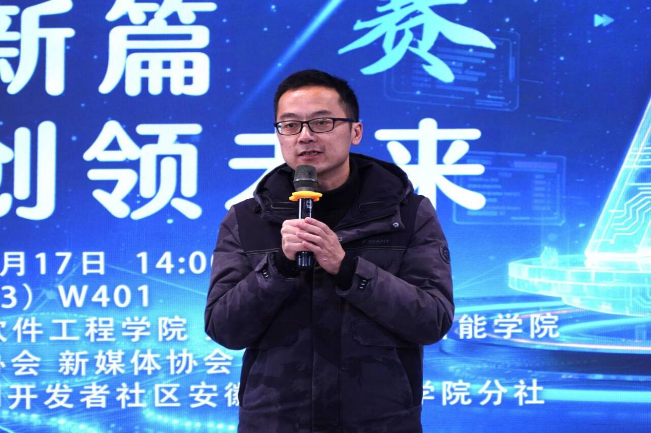 为引领人工智能领域探索新风向,赋能学子创新实践,激活潜在动能。由安徽信息工程学院紫云英创新创业学院主办、计算机与软件工程学院(大数据与人工智能学院)承办的第六届安徽信息工程学院人工智能创意挑战赛于2025年12月17日14:00在博学楼W401成功举办决赛。出席本次比赛的嘉宾和评委老师有教务处副处长程玉林、计算机(大数据)学院副院长朱洪军、软件工程教研室教师窦慧敏、黄洋洋、刘众奇、人工智能教研室教师胡婷婷、计算机科学与技术教研室教师沈琼。比赛伊始,程玉林率先登台致辞,向出席的各位老师及全体参赛选手致以最热烈的欢迎和诚挚的问候。他强调了人工智能在科技创新与人才培养中的重要意义,肯定了举办此类赛事对于激发学生创新思维、提升实践能力的积极作用,并鼓励同学们勇于探索、学以致用,将前沿技术与现实需求相结合 (图为程玉林进行开场致辞)随后,各参赛队伍依次登台,围绕作品的核心创意、技术实现路径等关键维度展开汇报。在答辩环节中,评委老师们从创意新颖度、技术突破点、实际应用价值等多个核心维度,对每一份作品