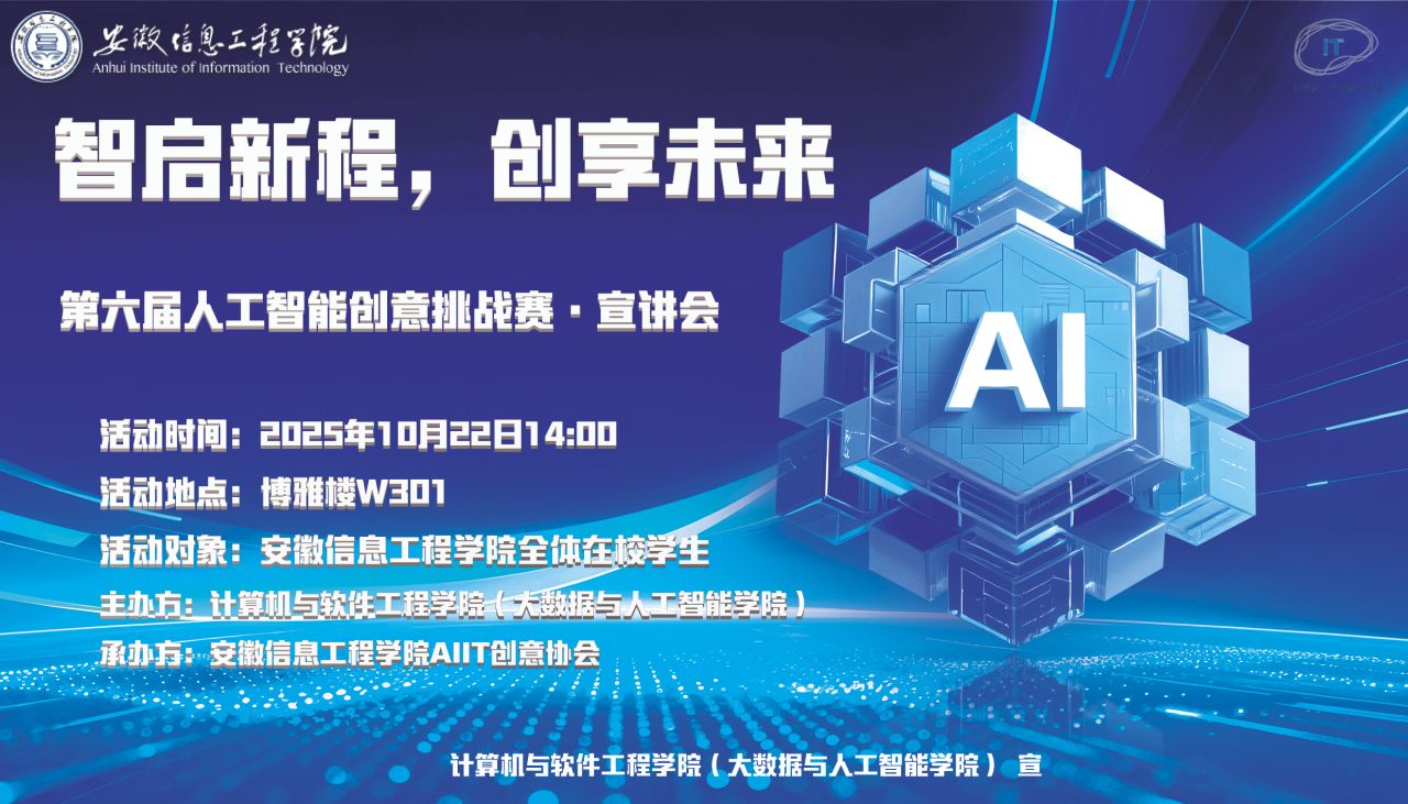 各学院:为了进一步激发学生对人工智能技术的探索热情,提升他们的创新思维、实践操作能力以及团队协作精神,安徽信息工程学院在此特举办第六届“安徽信息工程学院人工智能创意挑战赛”。现将有关事项通知如下:一、大赛主题智绘新篇,创领未来二、参赛对象安徽信息工程学院全体在籍在校大一新生三、组织单位主办单位:安徽信息工程学院教务处承办单位:计算机与软件工程学院、大数据与人工智能学院四、参赛范围及方向参赛项目要求应以围绕人工智能为主旨,以创新的技术应用为手段,构建智慧校园以及创新创业发展应用,能够更好的改变我们的学习、工作与生活方式。参赛作品以人工智能技术应用为主题,可以是智慧校园应用、智能制造、智能家居、智能硬件等;应用类别不限,参赛作品形式不限,可参考形式:小程序、智能制造、APP、云服务、桌面应用、智能硬件系统等。五、参赛项目要求(一)项目内容要求参赛项目务必真实、健康、合法,无任何不良信息,项目立意应弘扬正能量,践行社会主义核心价值观。参赛项目需为自主创新设计,要立足实际,设计出能解决校园学习与
