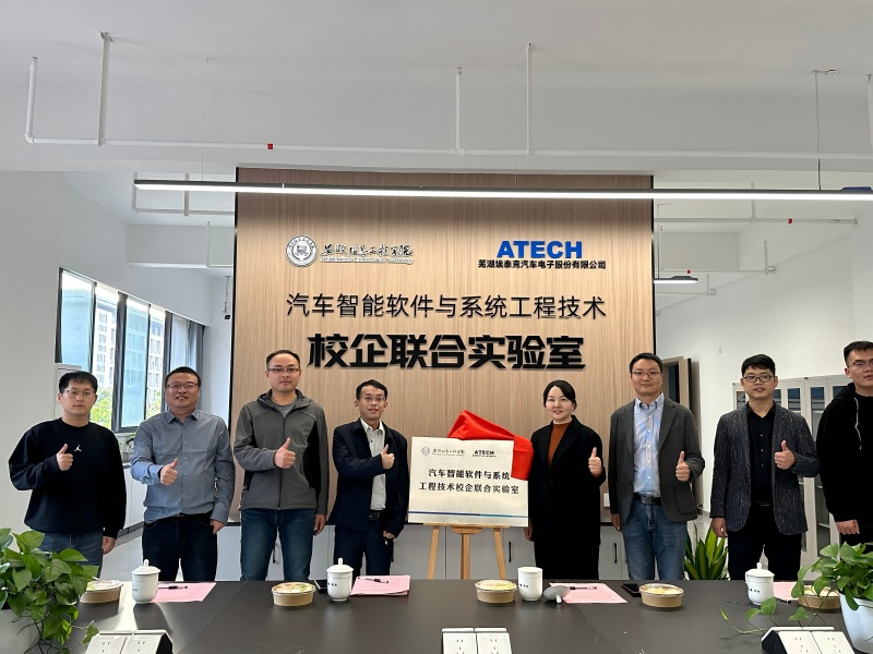 10月29日,芜湖埃泰克汽车电子股份有限公司软件中心技术总监冯晓星、研发工程管理部经理郭雅杰、工程师陈智杰一行到访安徽信息工程学院,就校企合作与科研共建展开交流。科技处副处长王伟、计算机(大数据)学院党总支书记、副院长戴平,副院长夏林,院长助理柏琪,科研秘书刘剑琴,工业互联网产业学院综合主管杜昭强等热情接待企业代表。双方共同为“汽车智能软件与系统工程技术联合实验室”揭牌,标志着双方合作迈入新的发展阶段。(图为校企双方代表揭牌)揭牌仪式上,戴平代表学校对埃泰克公司一行的到来表示热烈欢迎,并介绍了与会嘉宾。她回顾了自2021年以来双方在产教融合领域的系列合作成果,包括共建优秀实习就业基地、省级实践教育基地及共办工业互联网产业学院汽车电子嵌入式软件方向等,为此次联合实验室的成立奠定了坚实基础。“汽车智能软件与系统工程技术联合实验室”的成立,是双方在既有合作成果基础上的全新升级。实验室将聚焦汽车电子、智能网联技术及嵌入式系统等前沿领域,成为技术创新的重要平台、人才培养的重要载体与科研成果转化的重